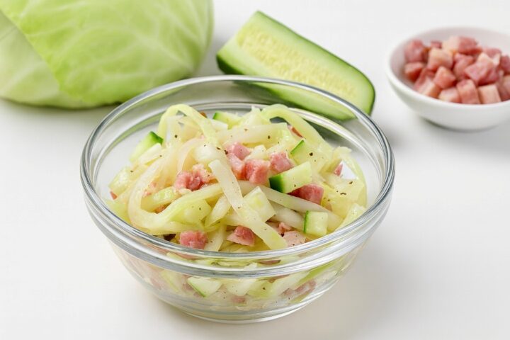 Tento salát spojuje křupavost čerstvého zelí, šťavnatost okurky a chuťově výraznou slaninu s jemně pikantní zálivkou. Skvělý jako příloha ke grilovanému masu nebo samostatný lehký oběd. Díky jednoduché přípravě a dostupným surovinám si ho snadno zařadíte do běžného jídelníčku.