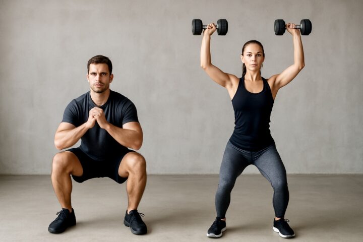 V prvním díle jsme se podrobně věnovali výpadům a klikům – dvěma základním cvikům, které posilují celé tělo. Dnes přidáváme další dvě efektivní a jednoduché varianty: dřepy (squats) a tah s jednoručkami nad hlavu ve stoji (standing overhead dumbbell press). Oba cviky zařazují profesionální trenéři do základních plánů právě proto, že zapojují mnoho svalových skupin zároveň a lze je upravit podle kondice každého cvičence.
