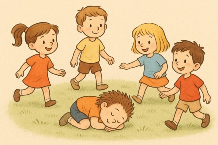 Pravidla: Jedno dítě je „ježek“ – klekne si na zem, položí hlavu na spojené ruce a předstírá, že spí. Ostatní děti chodí v kruhu kolem něj a recitují básničku. Na poslední slovo jedno dítě jemně plácne „ježka“ po zádech. „Ježek“ se probudí a snaží se chytit některého z hráčů. Koho chytí, ten se stává novým „ježkem“.