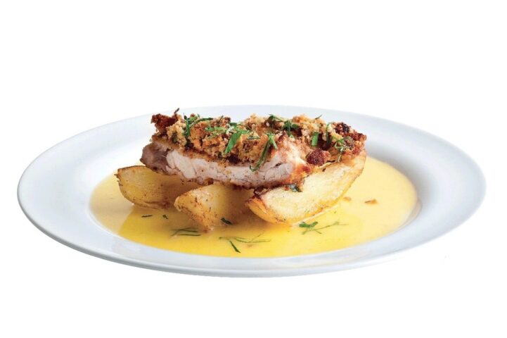 - Maso důkladně obalte ve strouhance, rukama ji přitlačte a vložte maso kůží dolů na pánev. Opékejte 1 minutu z každé strany.