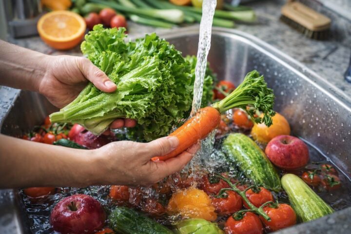 Omytí ovoce a zeleniny pod tekoucí pitnou vodou patří k nejjednodušším a zároveň nejúčinnějším krokům domácí hygieny. Proud vody působí mechanicky a z povrchu plodů odplavuje část mikroorganismů, prach i zbytky půdy. To, co člověk vnímá jako krátký a jemný oplach, představuje z mikrobiologického hlediska výrazný fyzikální zásah. Většina bakterií se na povrchu potravin neváže pevně, a proto je proud vody schopen je fyzicky odstranit. Výsledkem je podstatné snížení mikrobiální zátěže ještě před samotnou konzumací nebo další kuchyňskou úpravou.