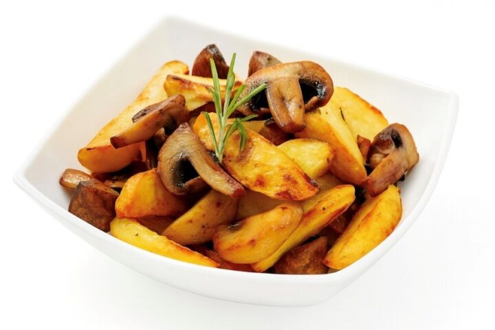 - Přidejte brambory do pánve k žampionům, zvyšte teplotu a společně vše krátce osmahněte dozlatova, aby brambory získaly křupavou krustu.